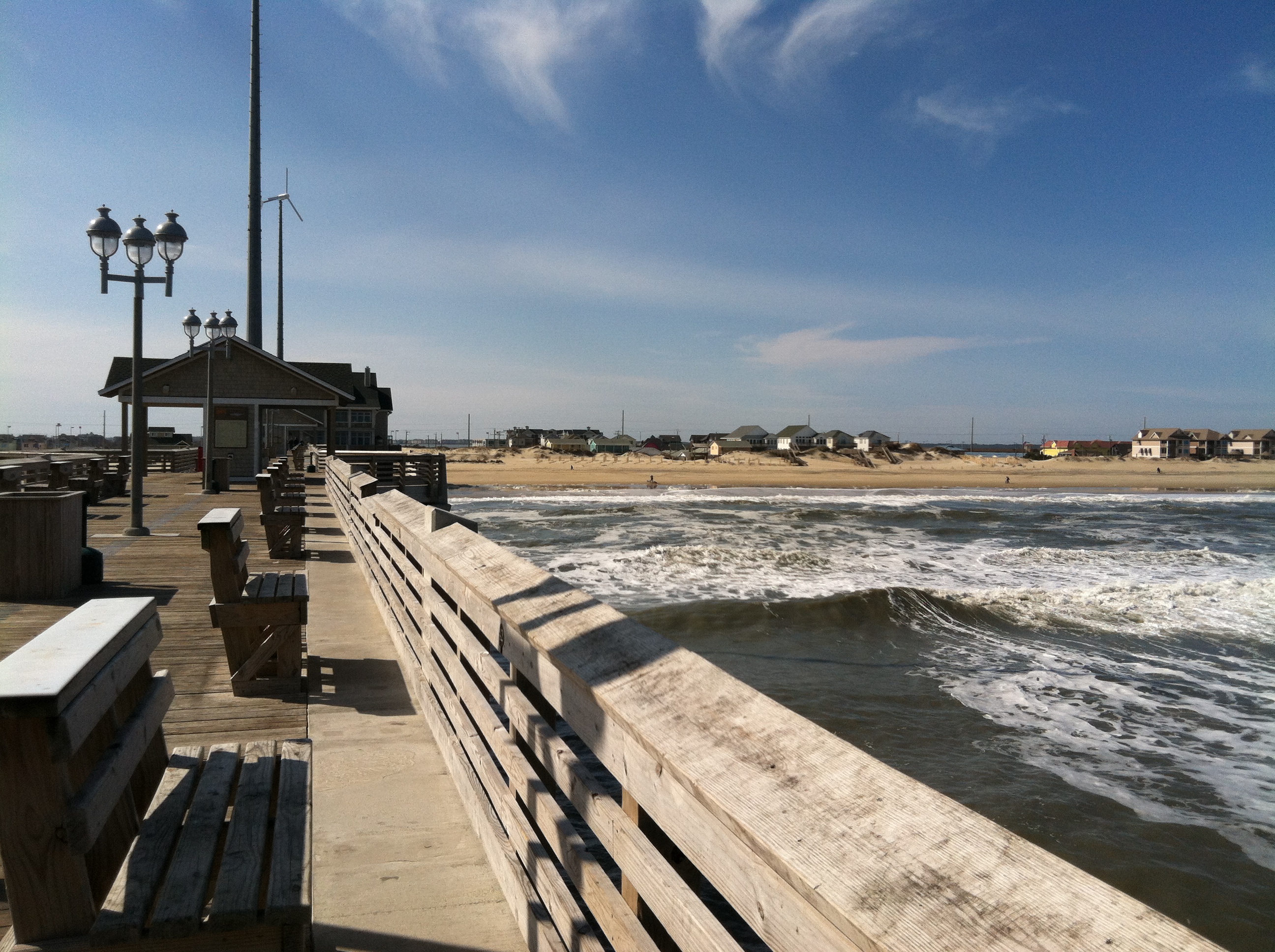 The next day, we spent a little time at Jennette’s Pier, which offers great views of the Outer Banks beach. We had hoped to obtain a driving permit for the beach so we could cruise in the Subie over the sand, but it turned out you couldn’t get them on Sundays, much to my chagrin. There was no one on the beach, and I’m sure our Subaru would have made a good beach buggy! We still enjoyed the views from the pier, though.